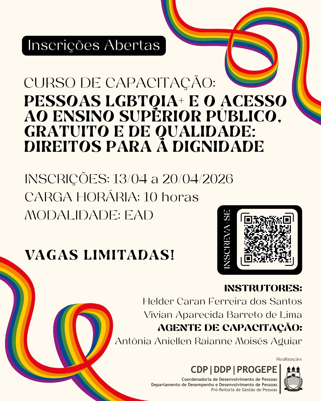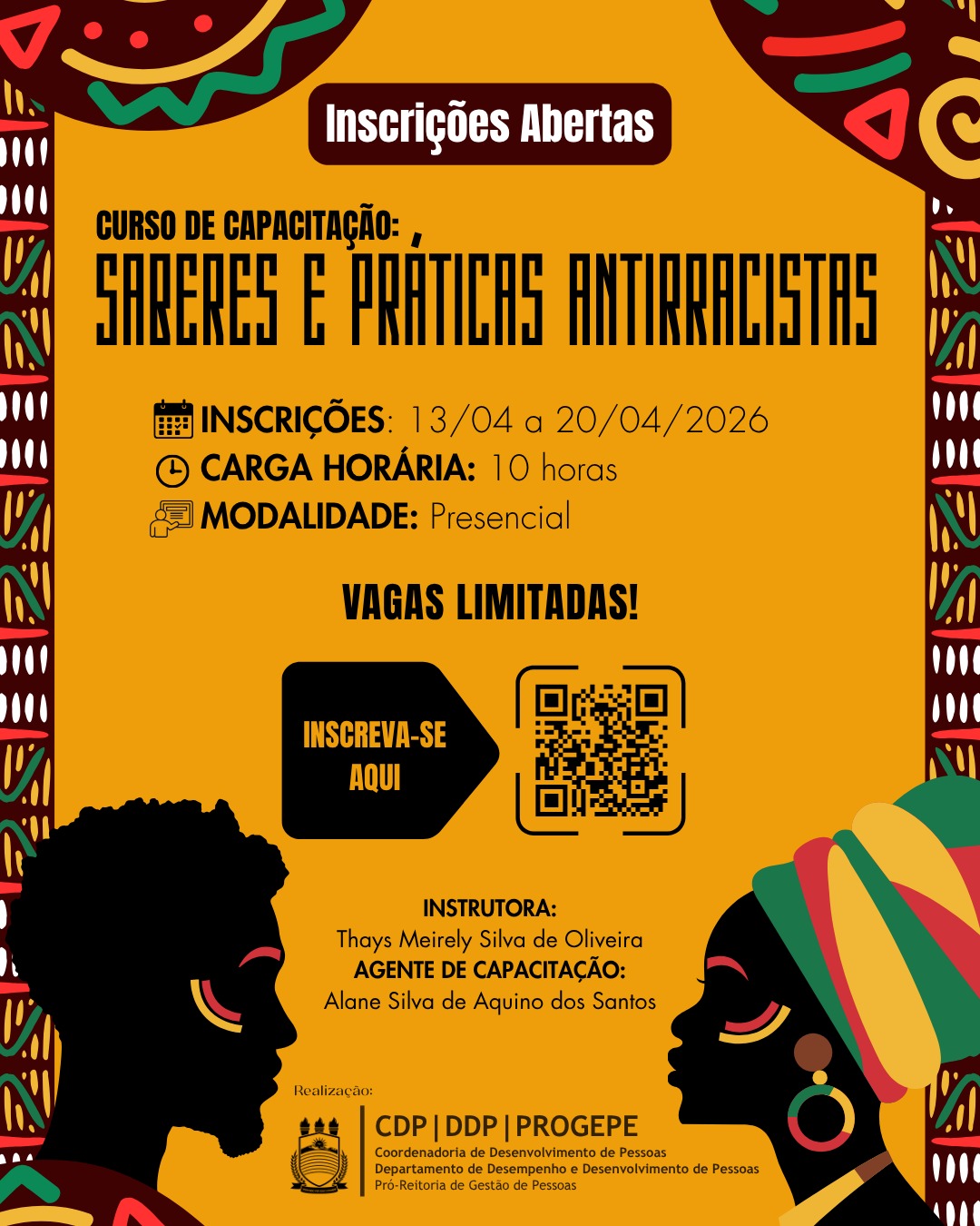 Ações e Capacitações – DDP Tópicos em Gestão Pública: Pessoas LGBTQIA+ e o acesso ao ensino superior público, gratuito e de qualidade: direitos para a dignidade INSCRIÇÕES DE 13 A 20/04/2026. TOTAL DE VAGAS: 40. Saberes e Práticas Antirracistas na universidadeINSCRIÇÕES DE 13 A 20/04/2026. TOTAL DE VAGAS: 30.